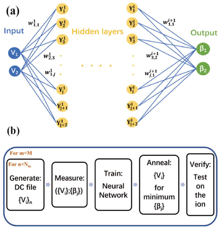 研究人员通过采集不同电极的电压参数组合对应的微运动参数,构建神经网络并对构建的模型进行训练。然后使用模拟退火算法找到模型的最小值对应的电极电压参数,达到补偿额外微运动的效果。此方法通过对实验数据的建模和机器学习(如图二所示),实现了补偿额外微运动的自动化。
